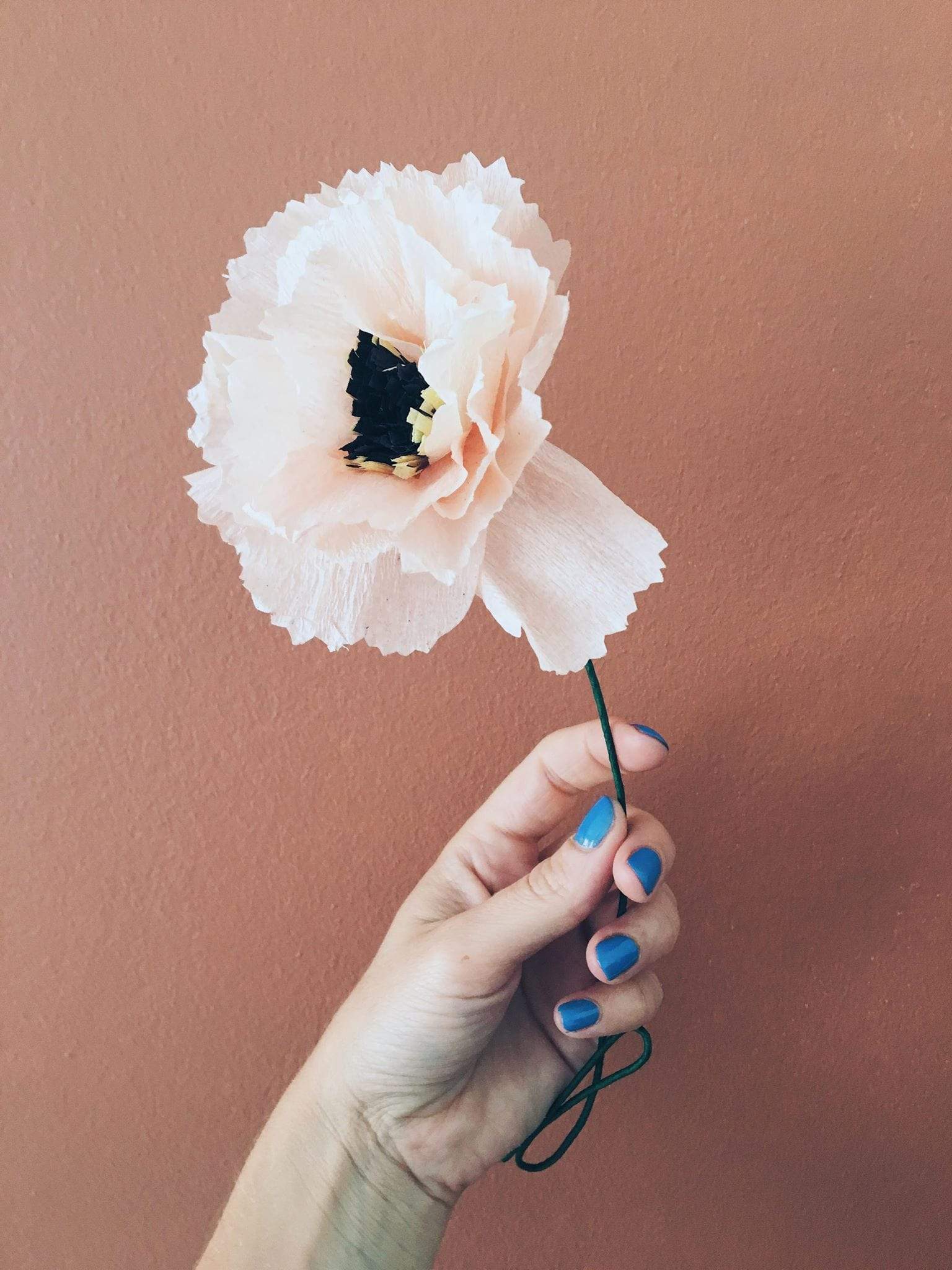 Diese handgemachte Papierblume besteht aus durchgefärbtem Krepppapier und ist an einem langen, flexiblen grünen Stiel befestigt. Du kannst den Stiel in jede beliebige Richtung biegen, um die gewünschte Form und Länge zu erhalten.