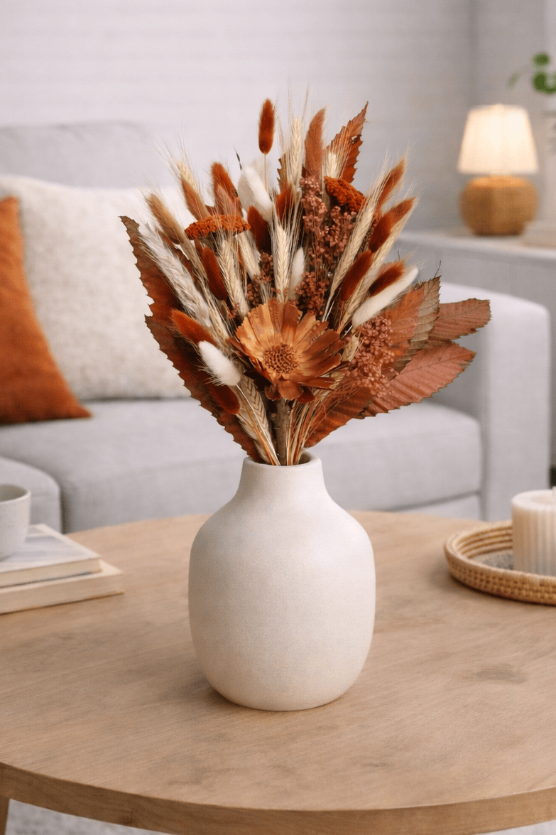 Ein langanhaltender Trockenstrauß perfekt als Geschenk zum Geburtstag, Jahrestag oder Hochzeitstag. Mit Liebe von unseren Floristinnen handgebunden mit konservierten Laubblättern, Protea und vielen weiteren Trockenblumen in herbstlichen Laub-Farben