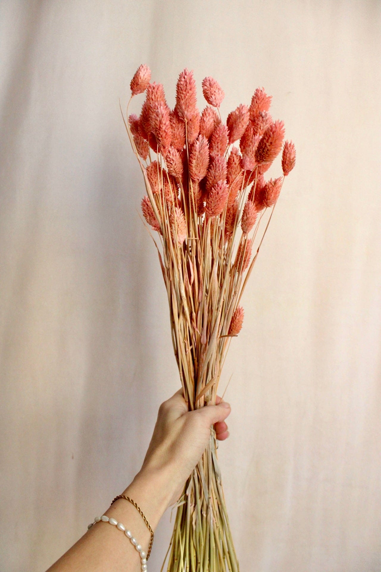Phalaris getrocknet, auch als Glanzgras bekannt, in einem schönen Rosa. Du kannst es perfekt mit weiteren Trockenblumen in Creme oder Natur mixen. Die Farbe ist auch perfekt für Hochzeitsdekoration.