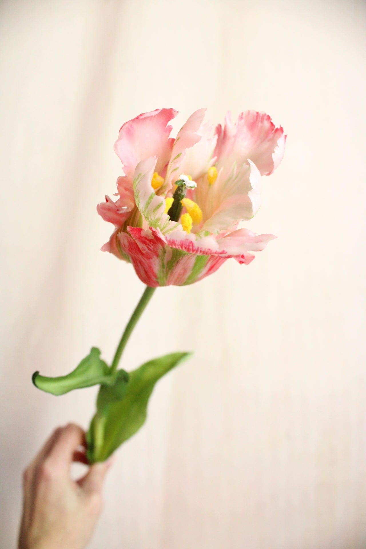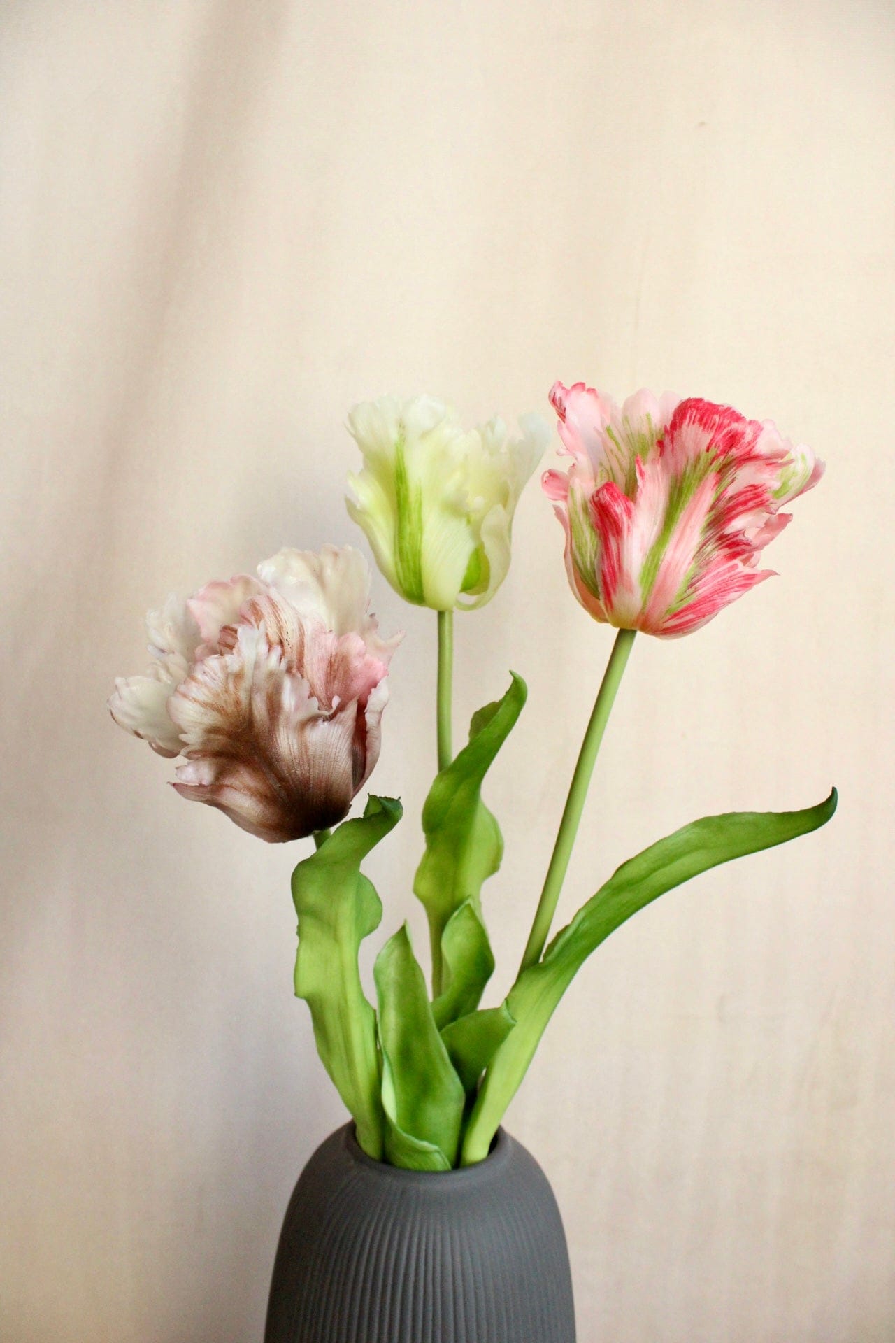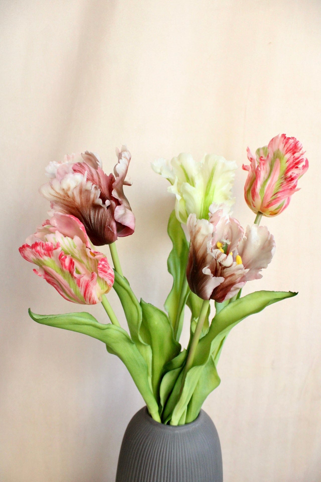 Die kunstvoll geformten Blüten der Papageien Tulpe sorgen mit ihren leicht gewellten Blütenblättern für eine besonders lebendige und natürliche Optik. Dadurch wirken die Kunsttulpen in der Vase wie echte Blumen und sind eine stilvolle Alternative zu frischen Schnittblumen.