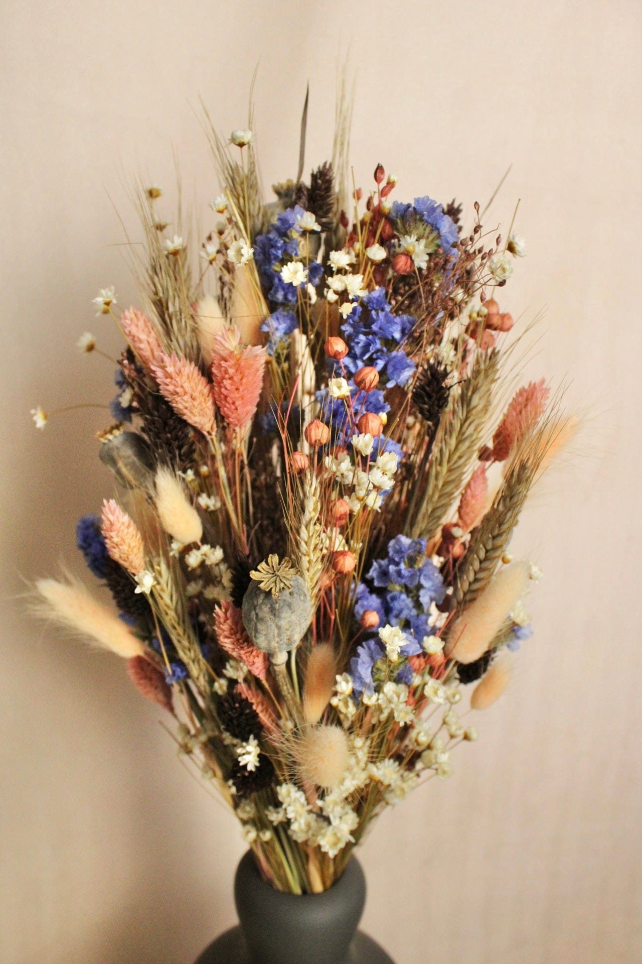 Trockenblumenstrauss „No. 114“ in Apricot & Blau mit Mohn & Strandflieder