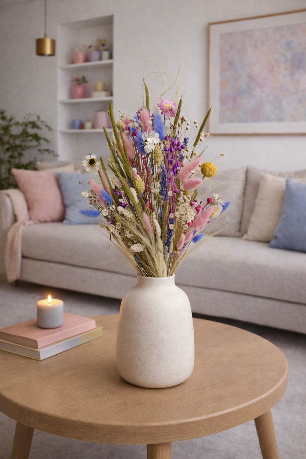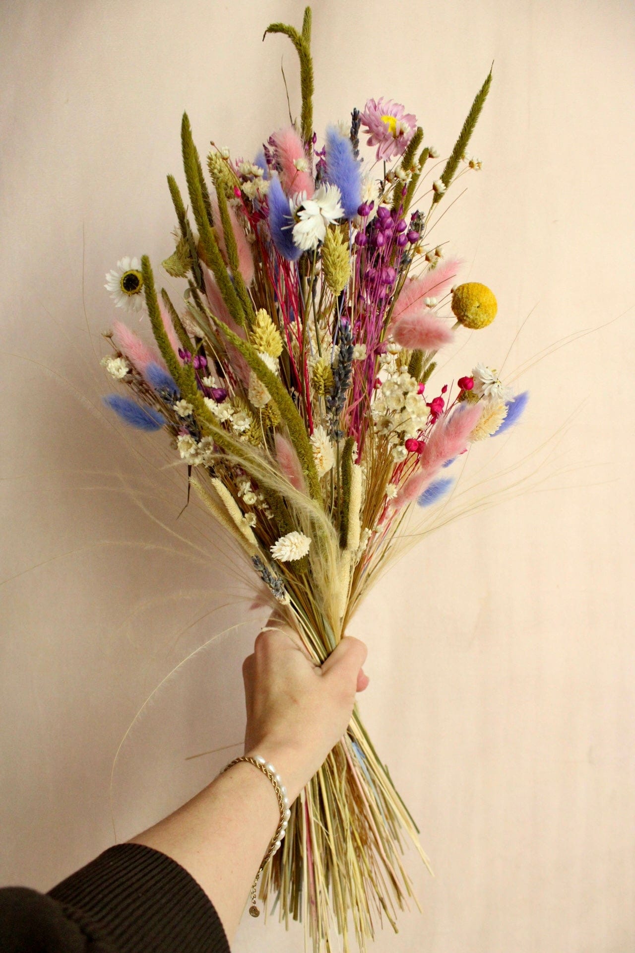 Ein langanhaltender Trockenstrauß perfekt als Geschenk zum Geburtstag, Jahrestag oder Hochzeitstag. Mit Liebe von unseren Floristinnen handgebunden mit Phalaris, Lagurus und vielen weiteren Trockenblumen in Rosa, Grün, Gelb, Lila und Cremeweiß.