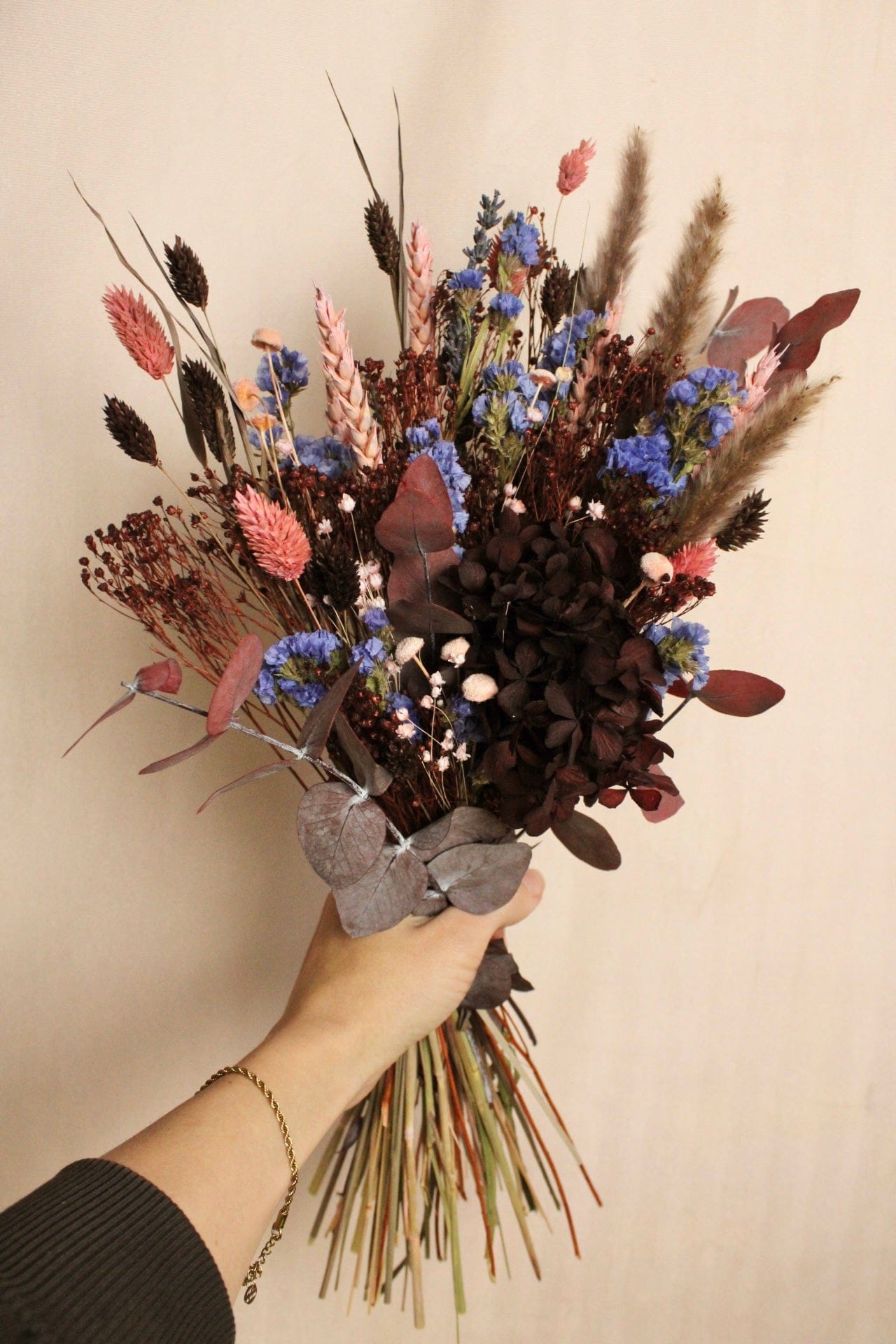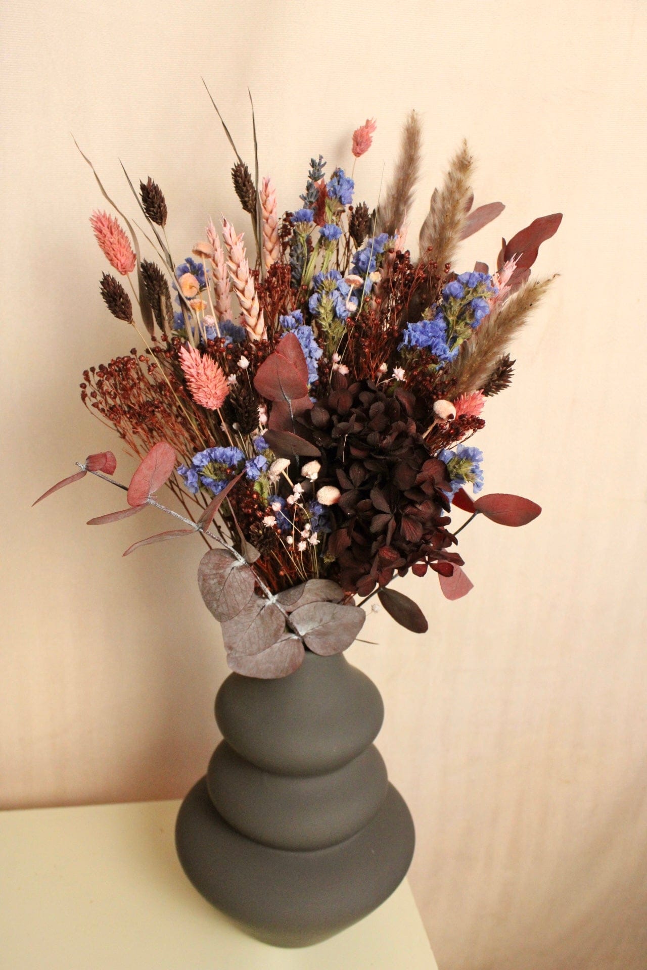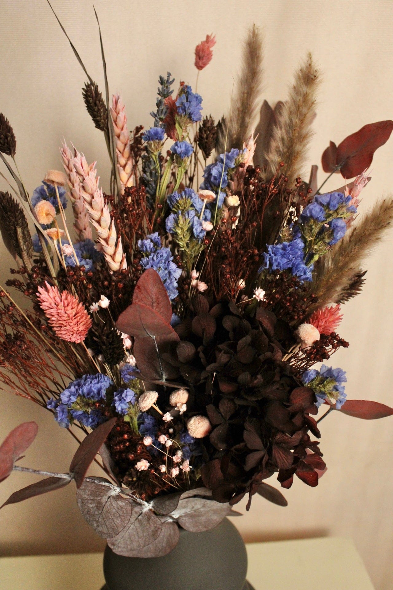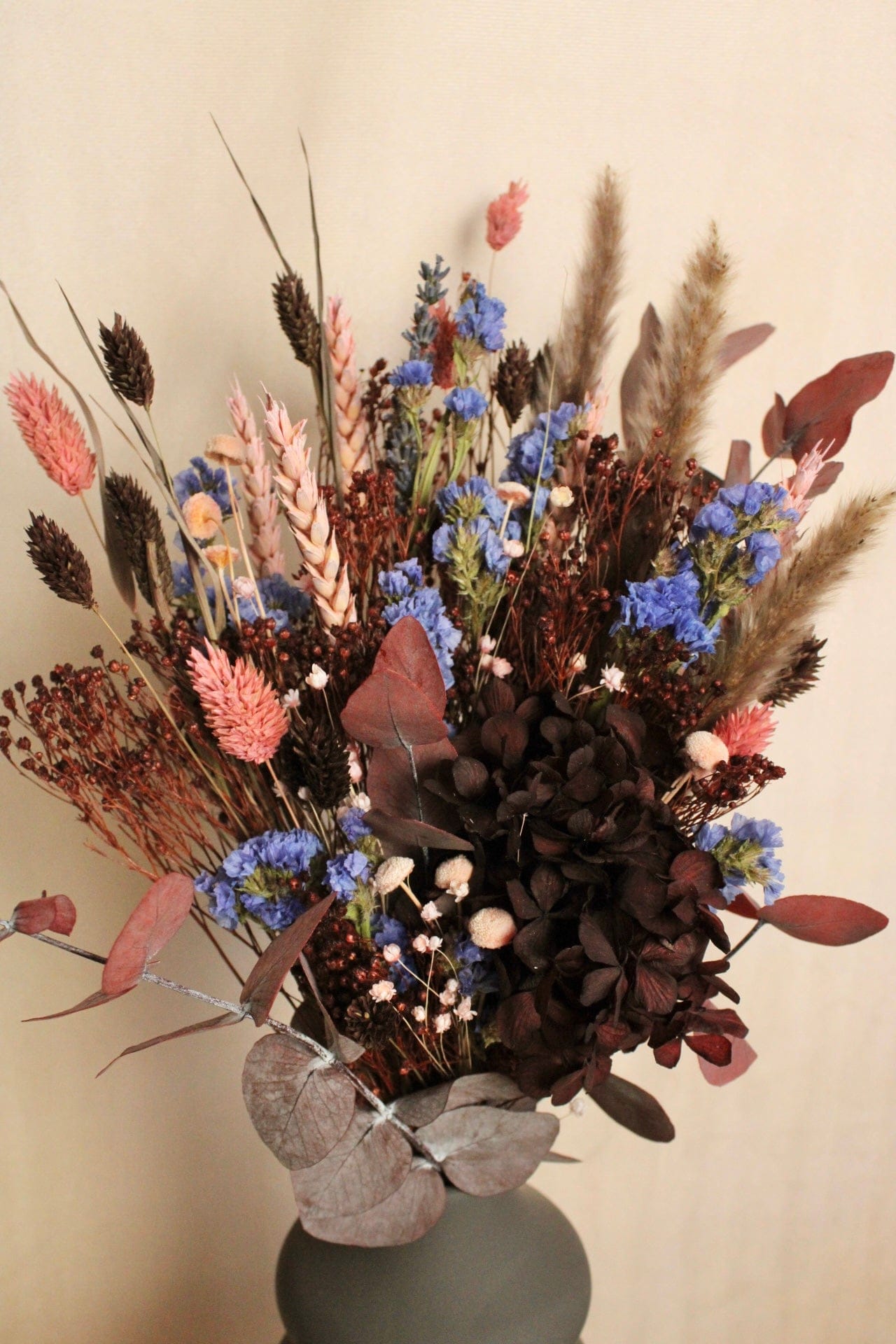 Ein langanhaltender Trockenstrauß perfekt als Geschenk zum Geburtstag, Jahrestag oder Hochzeitstag. Mit Liebe von unseren Floristinnen handgebunden mit Strandflieder, Hortensie, Eukalyptus und vielen weiteren Trockenblumen und konservierten Blumen in Rosa, Braun und Dunkelrot.