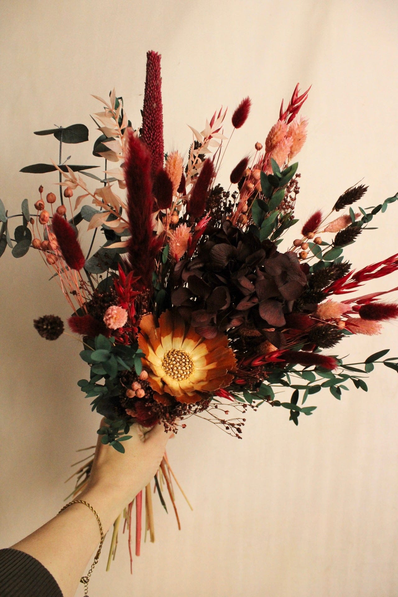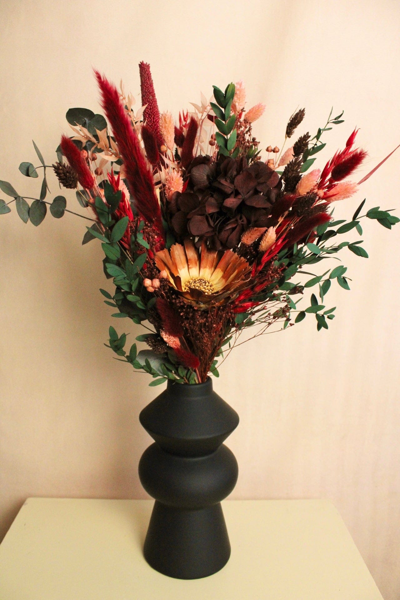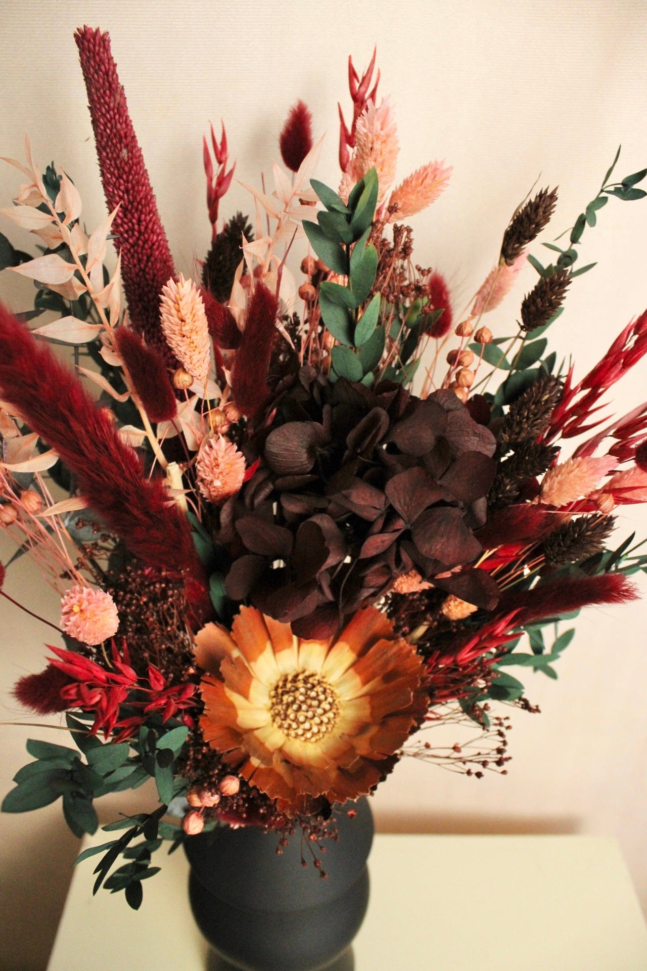 Trockenblumenstrauss „No. 111“ in Dunkelrot & Rosa mit Hortensie & Eukalyptus