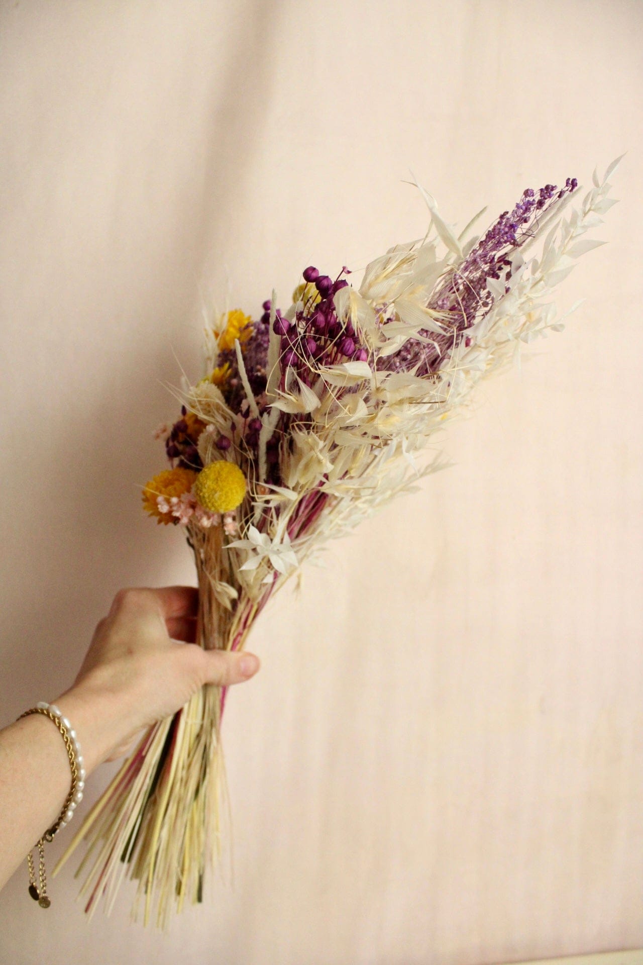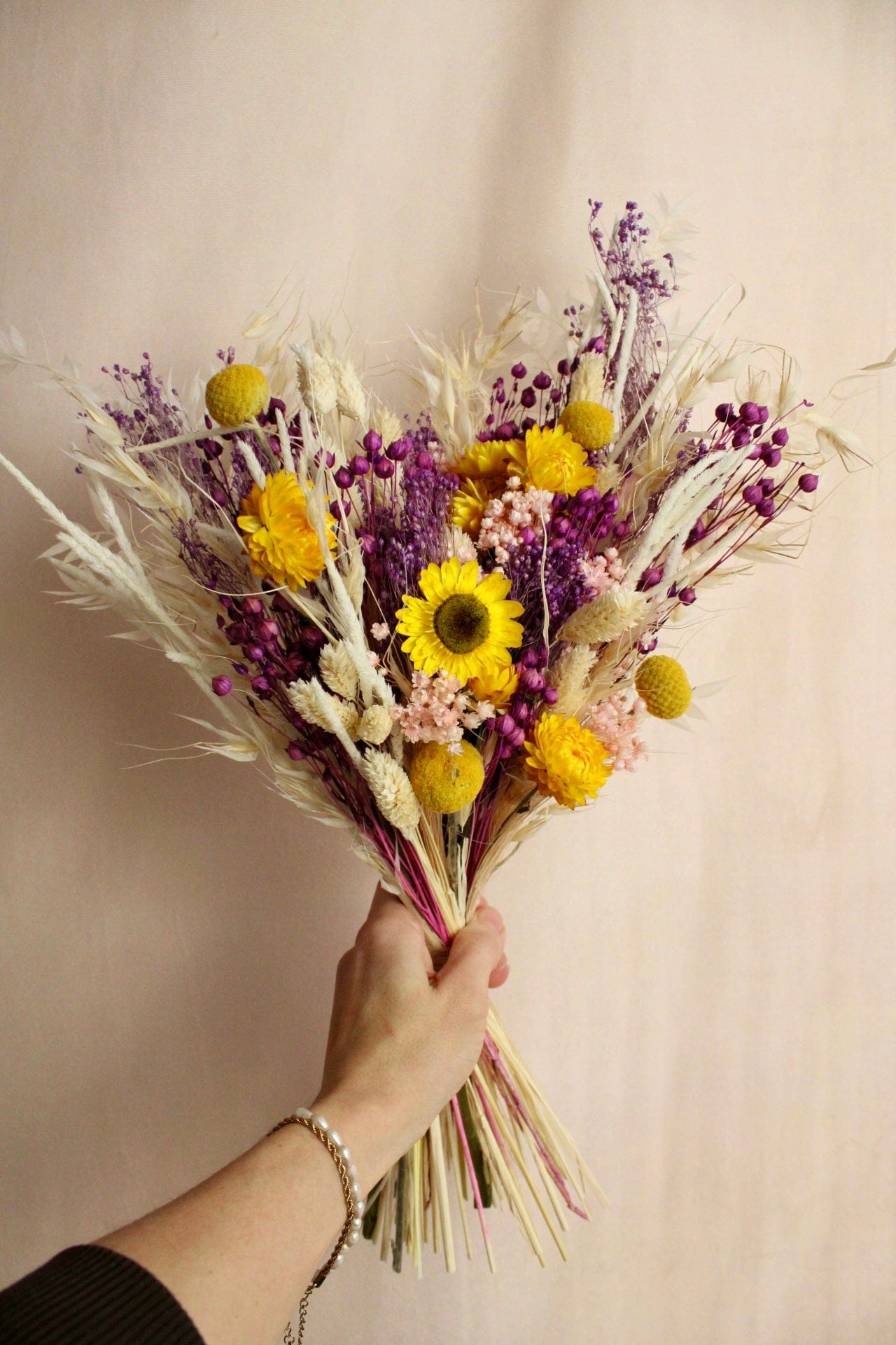 Trockenblumenstrauss „No. 127“ in Gelb & Lila mit Strohblumen