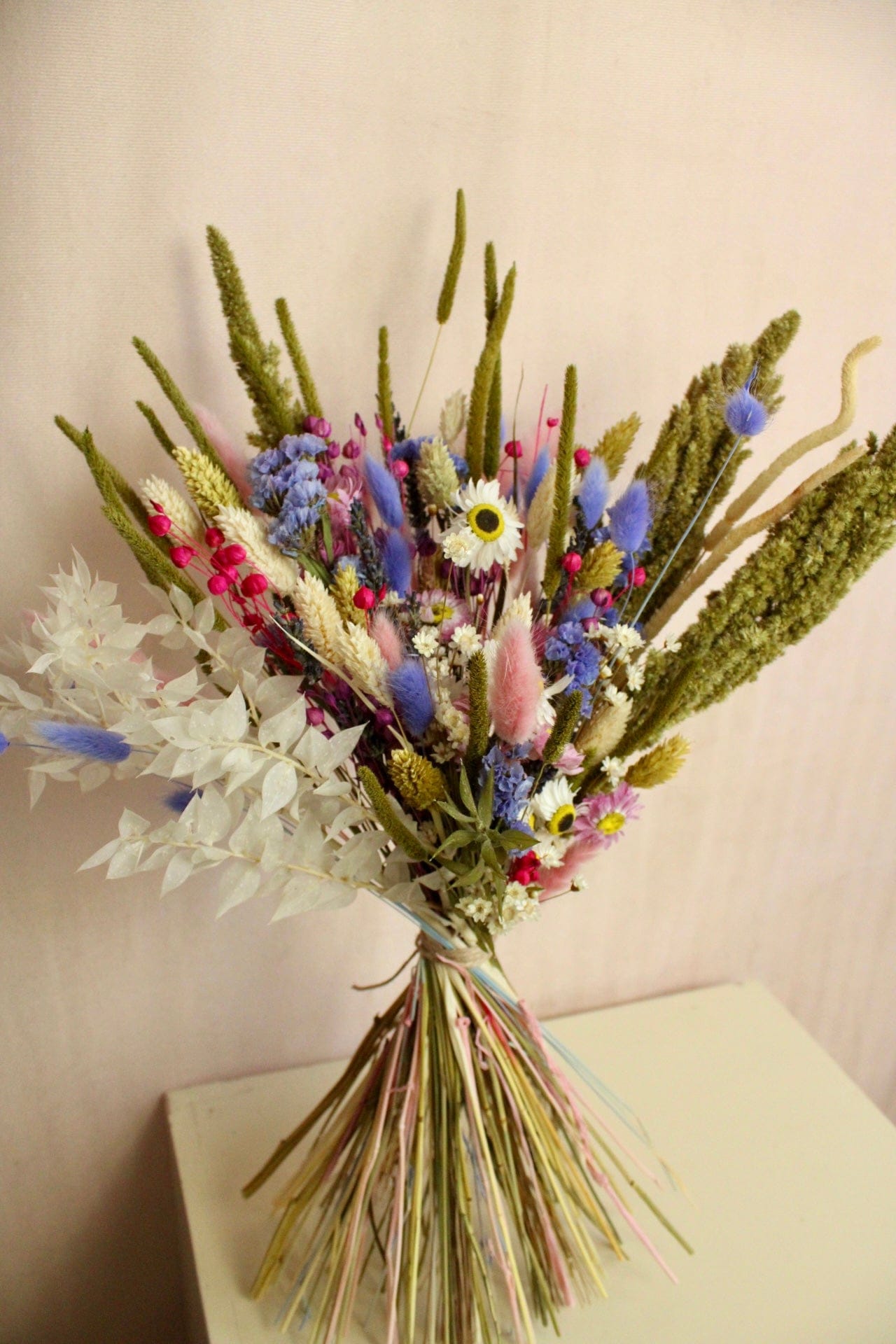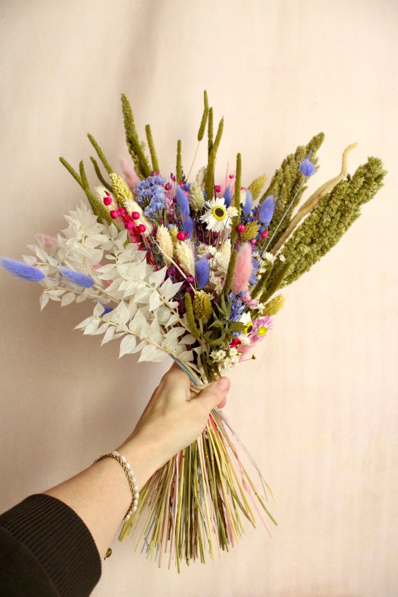 Ein langanhaltender Trockenstrauß perfekt als Geschenk zum Geburtstag, Jahrestag oder Hochzeitstag. Mit Liebe von unseren Floristinnen handgebunden mit Wiesenblumen, Amaranth, Strandflieder und vielen weiteren Trockenblumen in Pink, Grün und Lila.