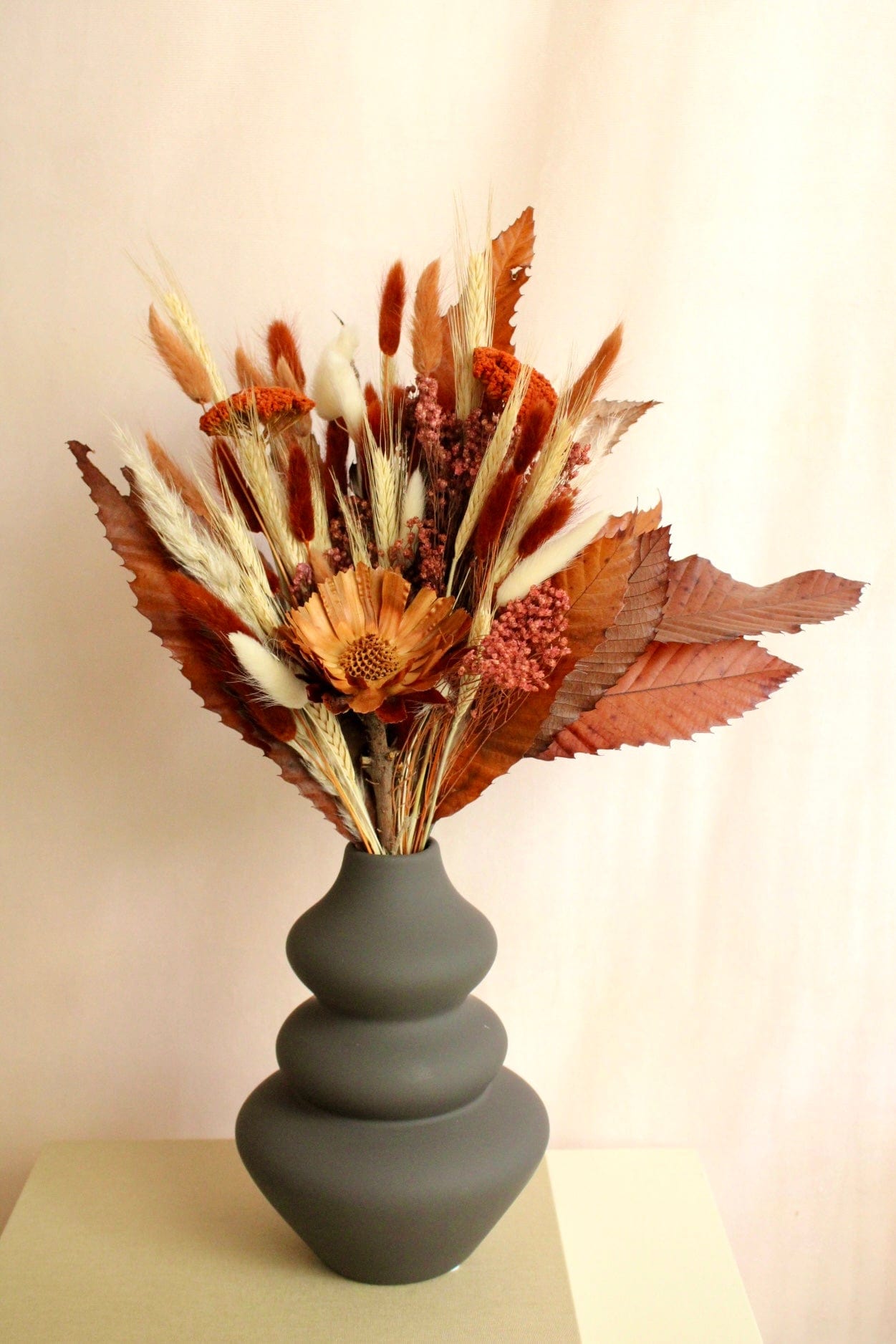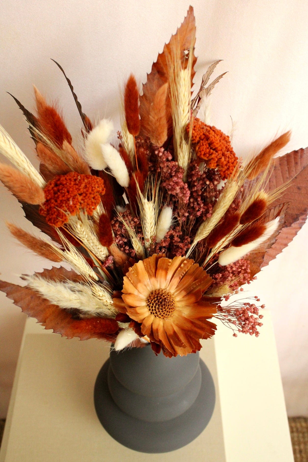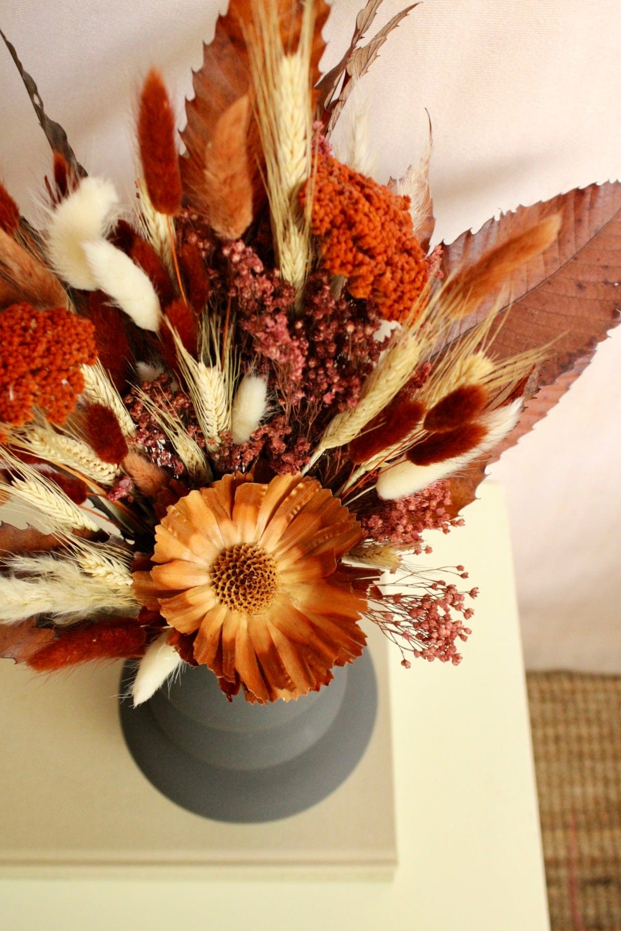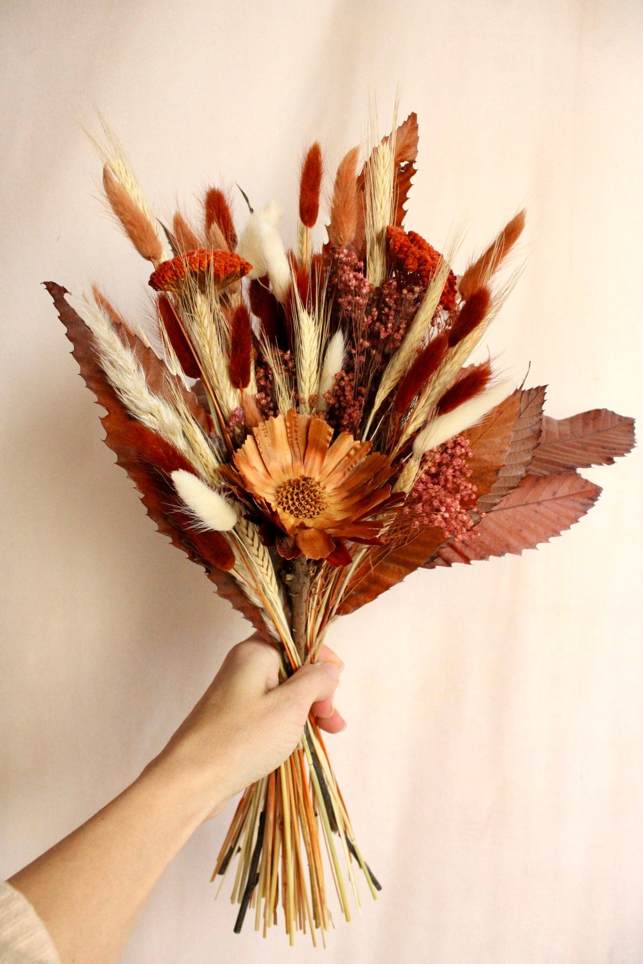 Ein langanhaltender Trockenstrauß perfekt als Geschenk zum Geburtstag, Jahrestag oder Hochzeitstag. Mit Liebe von unseren Floristinnen handgebunden mit konservierten Laubblättern, Protea und vielen weiteren Trockenblumen in herbstlichen Laub-Farben