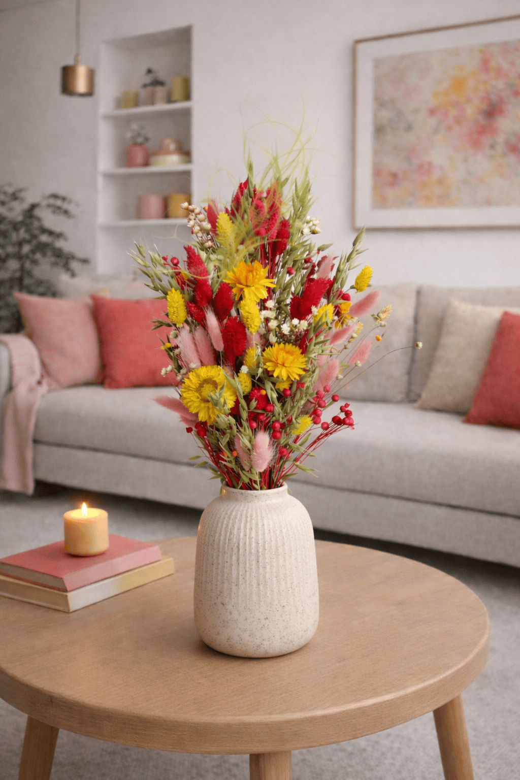 Ein langanhaltender Trockenstrauß perfekt als Geschenk zum Geburtstag, Jahrestag oder Hochzeitstag. Mit Liebe von unseren Floristinnen handgebunden mit Phalaris, Strohblumen und vielen weiteren Trockenblumen in Rosa, Gelb, Pink und Natur.