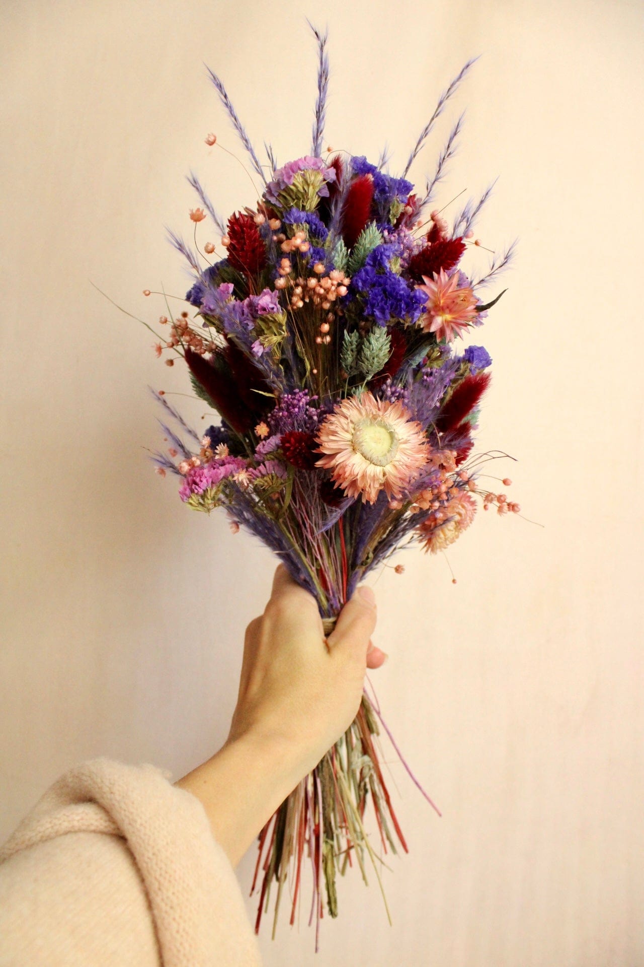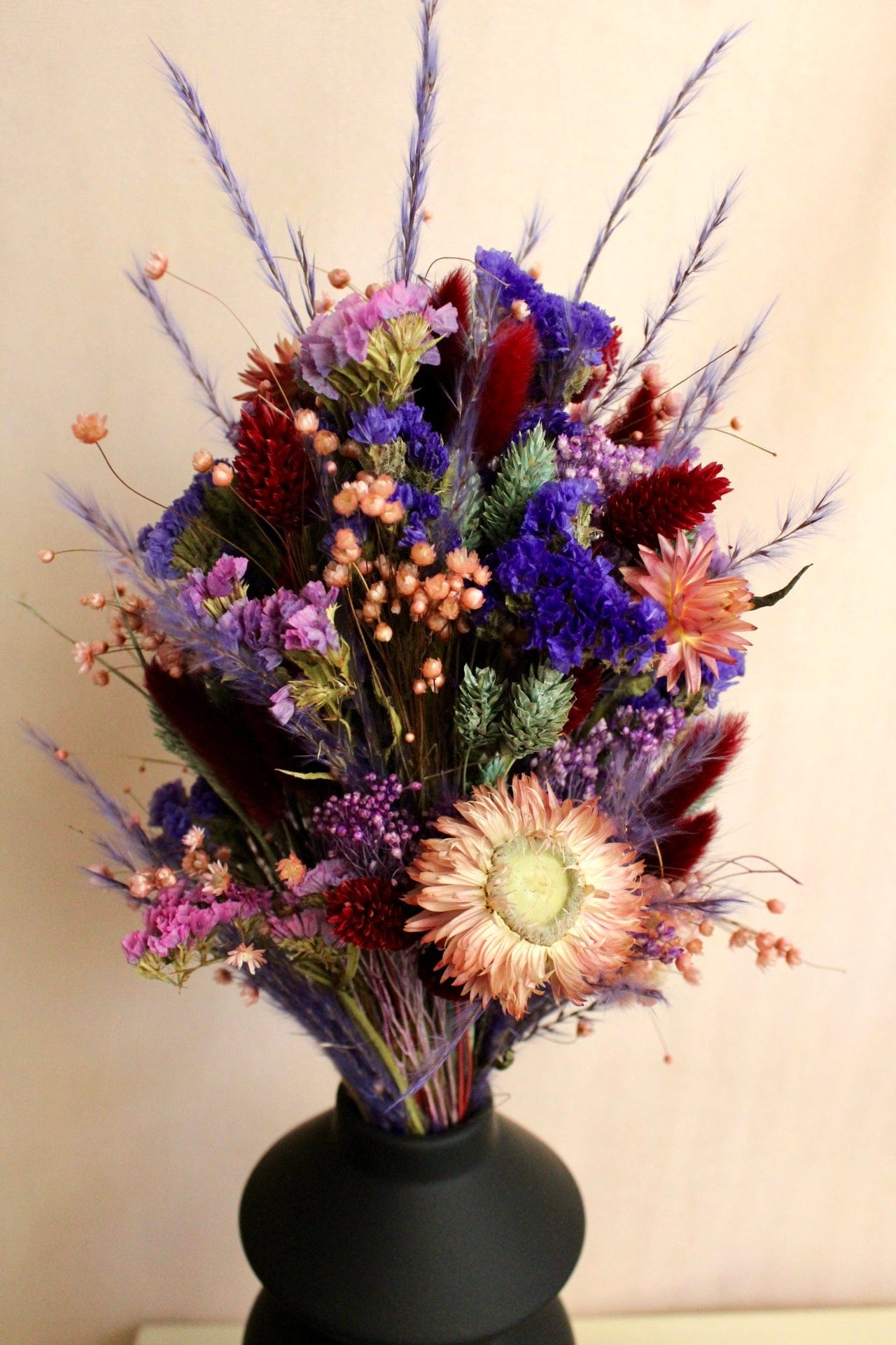 Ein langanhaltender Trockenstrauß perfekt als Geschenk zum Geburtstag, Jahrestag oder Hochzeitstag. Mit Liebe von unseren Floristinnen handgebunden mit Strohblumen, Strandflieder und vielen weiteren Trockenblumen in Rosa, Lila und Dunkelrot.