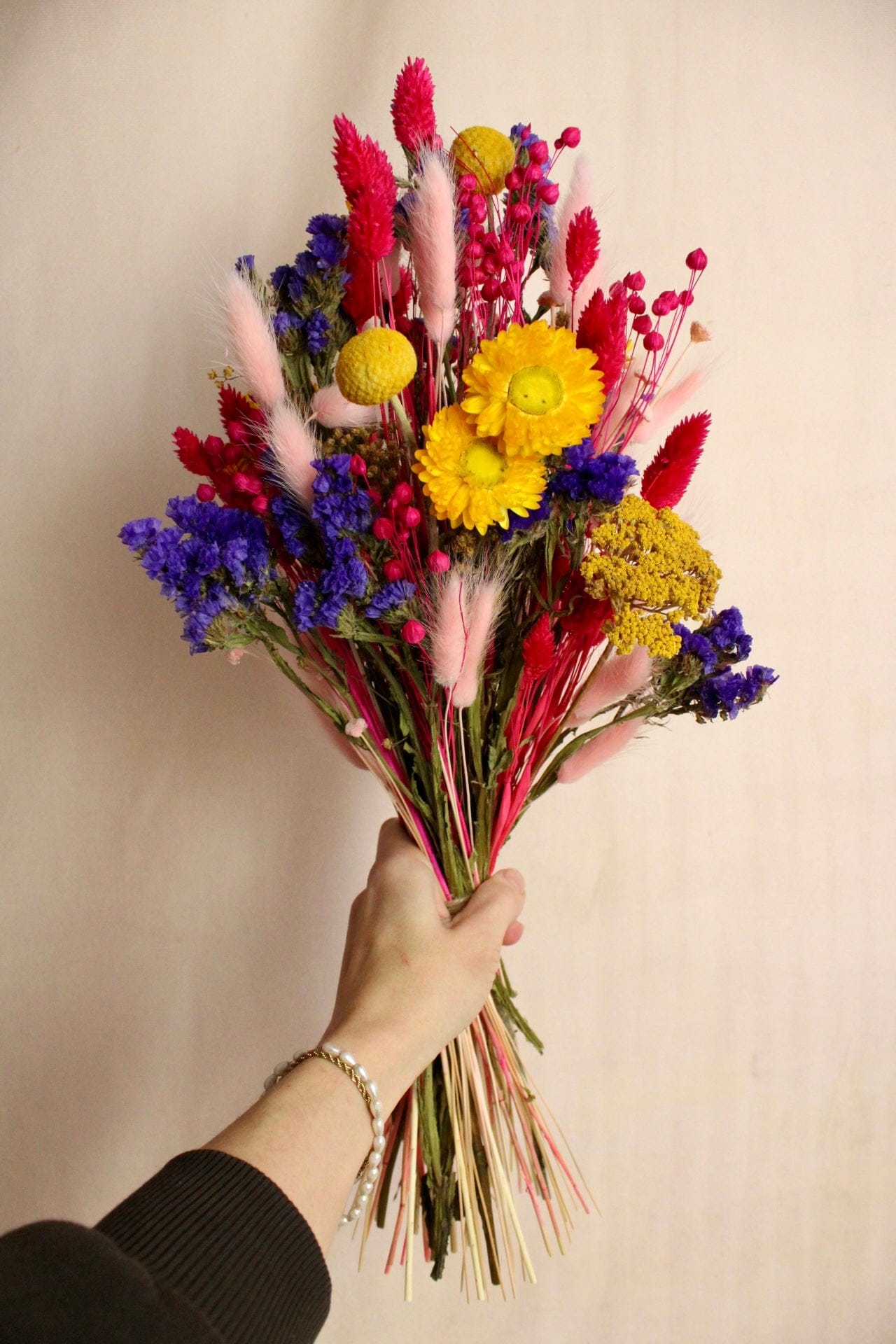 Trockenblumenstrauss mit Strohblumen und Strandflieder in Rosa, Gelb, Pink & Lila