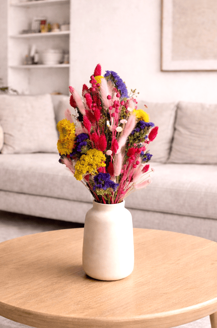 Ein langanhaltender Trockenstrauß perfekt als Geschenk zum Geburtstag, Jahrestag oder Hochzeitstag. Mit Liebe von unseren Floristinnen handgebunden mit Strohblumen, Strandflieder und vielen weiteren Trockenblumen in Rosa, Lila, Gelb und Pink.