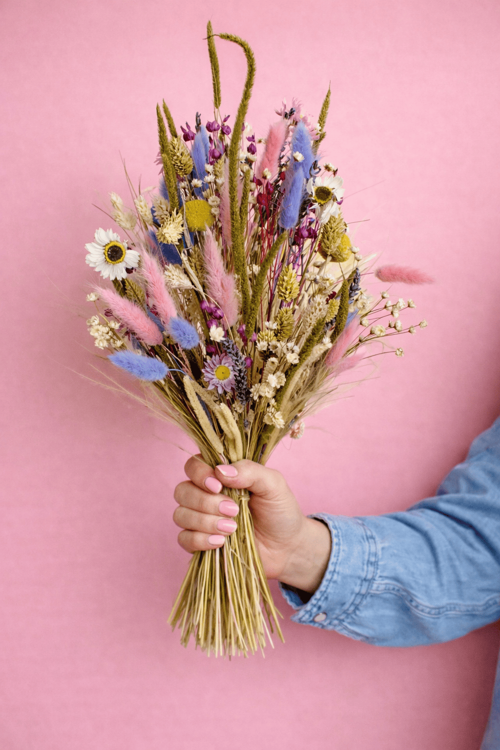 Ein langanhaltender Trockenstrauß perfekt als Geschenk zum Geburtstag, Jahrestag oder Hochzeitstag. Mit Liebe von unseren Floristinnen handgebunden mit Phalaris, Lagurus und vielen weiteren Trockenblumen in Rosa, Grün, Gelb, Lila und Cremeweiß.